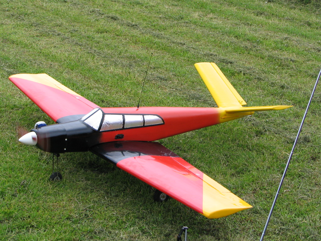 Der Erstflug verlief nicht ganz zufriedenstellend, der Motor (MVVS 15 ccm) lief ordentlich und ist auch ausreichend, alleine an Gewicht mangelt es ihm. Damit ist der SP einfach nicht hinzukriegen. Das Modell flog zwar geradeaus, reagierte aber auf Höhe hektisch.. In Lampertheim erwarb ich dann gestern einen 20 ccm Motor von SuperTigre, den ST 2000, der Gewichtsmässig dann besser passt. Ein Bericht mit dem neuen Motor folgt.