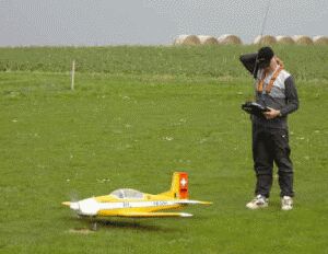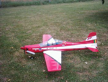 Den Flieger hatte mein Flugkollege Günny Ende April eingeflogen und attestierte im ein gutes Flugverhalten. In der zurückliegenden Zeit bewegte ich das Modell nun einige Male, meist mit etwas weichen Knien, durch die Luft und muss sagen langsam werde ich warm mit dieser >Bleiente<. Der Start ist unproblematisch, man muss sie nur etwas rennen lassen, sie lässt sie sich sehr gut fliegen, liegt stabil in Luft und macht auch einige Kunstflugfiguren ohne Mucken mit. Loopings müssen weiträumig angesetzt werden, holt man sie etwas eng rum macht sie am Scheitelpunkt eine halbe Rolle und fliegt in Normalposition weiter. Dies liegt vermutlich auch am neuen Motor, der nach ca 4 Litern Sprit sicher noch nicht seine volle Kraft entfalten kann. Das relativ weiche Flugverhalten resultiert aus kleinen Ruderausschlägen an den Querrudern. Werden diese zu gross gemacht wird das Modell ganz schnell sehr giftig. (Erfahrungen vom Vorgängermodell, B.u.l). Die Landung sollte man nicht zu steil ansetzen, durch ihr >Kampfgewicht< von ca. 6,5 kg wird sie dann sehr schnell, besser weit ausholen und mit etwas Schleppgas hereinholen, dann gelingen auch (meist) perfekte Landungen. Auf unserer Bahn (ca. 120 m) muss man auf frischgemähtem Rasen schon im ersten Drittel aufsetzen weil sie einen längeren Weg zum Ausrollen braucht. Vielleicht würden ihr deshalb Landeklappen ganz gut zu Gesicht stehen. Alles in allem kann man sagen, es ist ein angenehm zu fliegendes Modell das auch, durch seine realistische Bemalung, in der Luft ein schönes Flugbild abgibt. Bleibt nur zu hoffen dass die Freude daran etwas länger anhält als bei seinen beiden Vorgängern. (Fotos links unten)