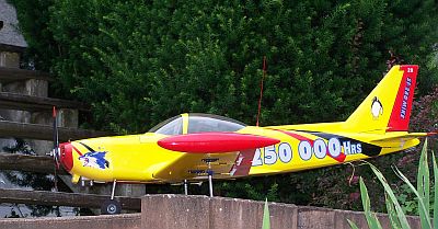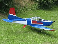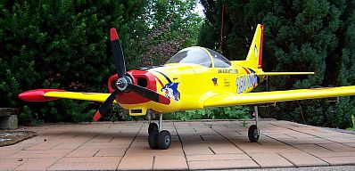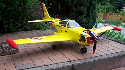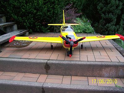 Die Tucano erstand ich auch aus Ebay, es war ein unberührter ARF Baukasten. Das Modell wird von Wild-Technik vertrieben und kostet dort ca 170 €. Ich konnte es ür 59.-€ erwerben. Der Rumpf ist in GFK Bauweise entstanden und ist kompl. lackiert, ebenso die Motorhaube. Die Cockpithaube besteht aus einem sehr spröden Kunsstoff, der leicht bricht, bzw. einreisst. Vorgesehen ist das Modell für ein Einziehfahrwerk, das sich aber schon beim ersten Rollversuch als nicht brauchbar erwies. So wurde die Tuc dann auf ein festes Fahrwerk umgerüstet, was wesentlich weniger Stress verursacht. Die Flugeigenschaften sind easy, Starten war ganz einfach, beim Erstflug musste kaum nachgetrimmt werden. Looping, Turn, Abschwung und dergleichen machte das Modell ohne Mucken, auch beim Rückenflug muss wenig gedrückt werden. Also ein Flieger ganz nach meinem Geschmack. Die Landung verlief nicht ganz so wie gewollt ( null Wind, Klappen vergessen und deshalb zu schnell) aber dank dem stabilen Fahrwerk ohne Besssuren. Bei der zweiten Landung, nun mit Klappen, wars auch nicht einfacher. Bim Ausfahren deselben hatte man das Gefühl gegen eine Wand geflogen zu sein. das Modell wurde brutal abgebremst. Man darf die Klappen (Spreizkl.) nur ein paar cm (ca. 20 Gr.)ausfahren, dann gelingen butterweiche Landungen.