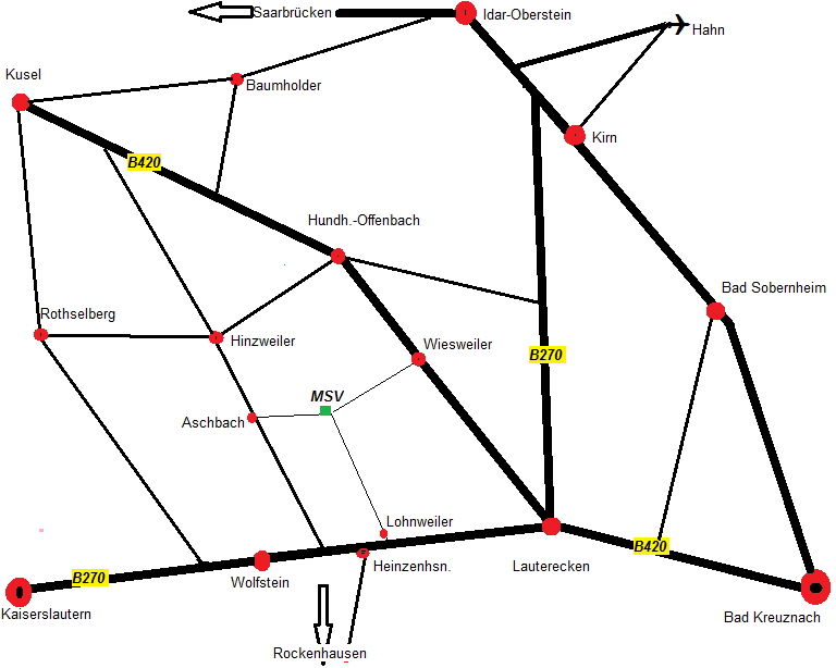 Anfahrt (b) über Aschbach von Hinzweiler kommend, Aschbach durchfahren, am Ortsende die Hauptstrasse nach links verlassen (VORSICHT KURVE !) von Wolfstein kommend am Reckweilerhof links in Richtung Aschbach abbiegen, Nach ca. 2,5 km (an der Feldscheune) gehts ganz scharf nach rechts auf den Teerweg. Hier sollte man geradeaus fahren und im Ort wenden !